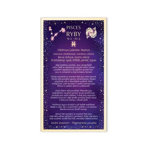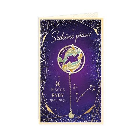 Blahopřání k narozeninám v luxusním provedení s metalickým efektem a kovovým přívěskem znamení zvěrokruhu - ryby. Kovový přívěsek může být použit například i ako záložka do knihy. Text uvnitř přání: "Všechno nejlepší, štestí a pokojenost ze srdce přeje". Součástí balení je také kartička s charakteristikou znamení a obálka. Originální technologie zpracování na blahopřání od společnosti ARGUS - "Na detailu záleží!"