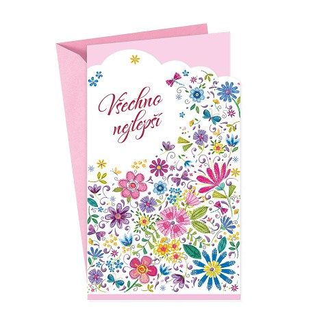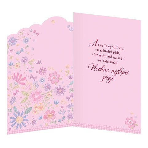 Přání k narozeninám nebo svátku pro ženu. Text uvnitř přání. Součástí blahopřání je také barevně sladěná obálka. Originální technologie zpracování přáníčka od společnosti ARGUS - "Na detailu záleží!"