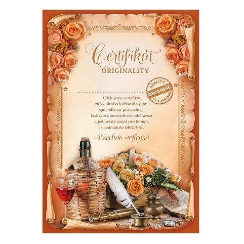 Přání - certifikát originality listina. S textem uvnitř blahopřání. Součástí balení je i barevně sladěná obálka. Originální technologie zpracování přáníčka od společnosti ARGUS - "Na detailu záleží!"