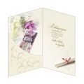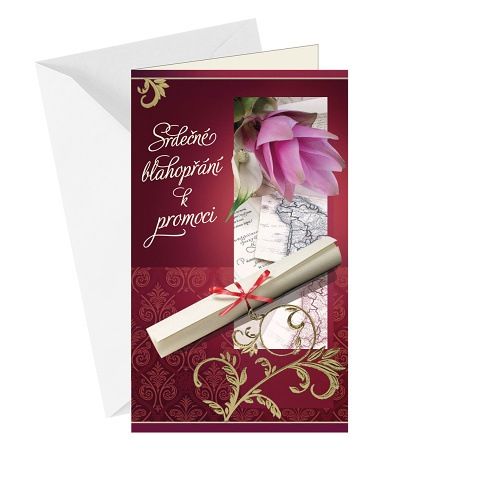 Blahopřání k promoci s textem uvnitř. Přidanou hodnotou přáníčka je kapsa na peníze, která se nachází uvnitř přání. Součástí blahopřání je barevně sladěna obálka. Originální technologie zpracování od společnosti ARGUS - "Na detaile záleží!"