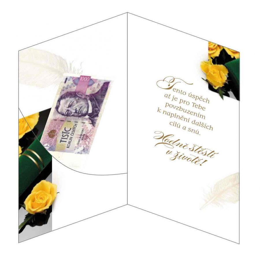 Blahopřání k promoci s textem uvnitř. Přidanou hodnotou přáníčka je kapsa na peníze, která se nachází uvnitř přání. Součástí blahopřání je barevně sladěna obálka. Originální technologie zpracování od společnosti ARGUS - "Na detaile záleží!"