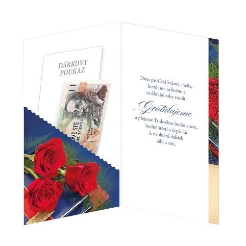 Blahopřání k promoci s textem uvnitř. Přidanou hodnotou přáníčka je kapsa na peníze uvnitř. Součástí přání je barevně sladěna obálka. Originální technologie zpracování od společnosti ARGUS - "Na detaile záleží!"