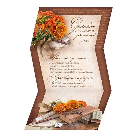 Blahopřání k promoci s textem uvnitř- listina. Součástí přání je barevně sladěna obálka. Originální technologie zpracování od společnosti ARGUS - "Na detaile záleží!"
