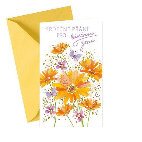 Přání pro ženu k narozeninám, svátku nebo jiné příležitosti s textem uvnitř. Součástí blahopřání je barevně sladěna obálka. Originální technologie zpracování přáníčka od společnosti ARGUS - "Na detailu záleží!"