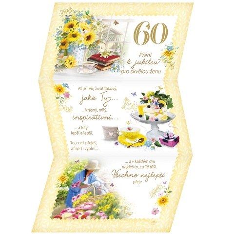 Přání k 60. narozeninám pro ženu- listina s textem. Součástí přání je také barevně sladěná obálka. Originální technologie zpracování na blahopřání od společnosti ARGUS - "Na detailu záleží!"
