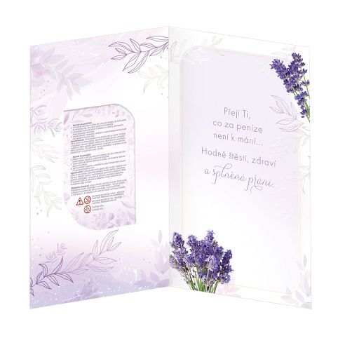 Voňavé přání k narozeninám, svátku, nebo jiné příležitosti s textem uvnitř přání a s malým dárkem - voňavý sáček s vůní levandule. Součástí blahopřání je také barevně sladěná obálka. Originální technologie zpracování přáníčka od společnosti ARGUS - "Na detailu záleží!"