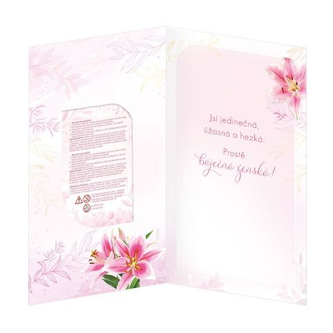 Voňavé přání pro ženu k narozeninám, svátku, nebo jiné příležitosti s textem uvnitř přání a s malým dárkem - voňavý sáček s vůní lilie. Součástí blahopřání je také barevně sladěná obálka. Originální technologie zpracování přáníčka od společnosti ARGUS - "Na detailu záleží!"