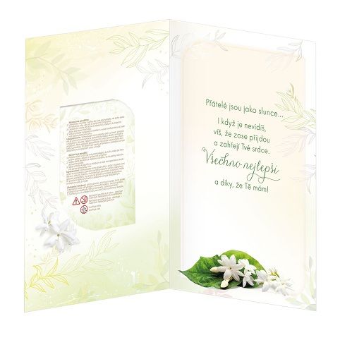 Voňavé přání pro kamarádku k narozeninám, svátku, nebo jiné příležitosti s textem uvnitř přání a s malým dárkem - voňavý sáček s vůní jasmínu. Součástí blahopřání je také barevně sladěná obálka. Originální technologie zpracování přáníčka od společnosti ARGUS - "Na detailu záleží!"