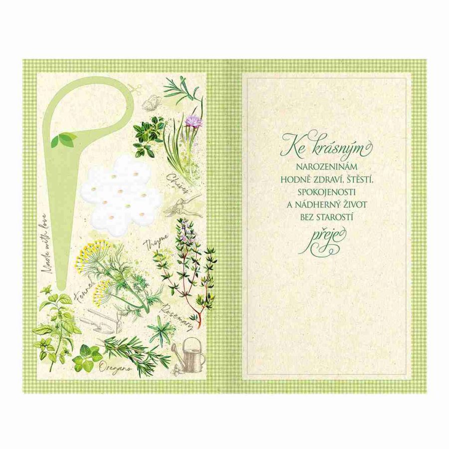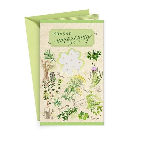 Narozeninové přání s textem uvnitř. Přání obsahuje semínka pažitky a instrukce k péči na zadní straně. Součástí blahopřání je barevně sladěna obálka. Originální technologie zpracování přáníčka od společnosti ARGUS - "Na detailu záleží!"