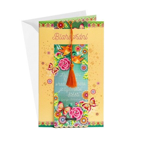Blahopřání se záložkou do knihy s metalickým efektem a textem uvnitř přání. Záložka do knihy s citátem, v luxusním provedení, s ozdobným střapcem je vhodná jako dárek pro ty, které máte rádi. Součástí přání je také barevně sladěná obálka. Originální technologie zpracování na blahopřání od společnosti ARGUS - "Na detailu záleží!"