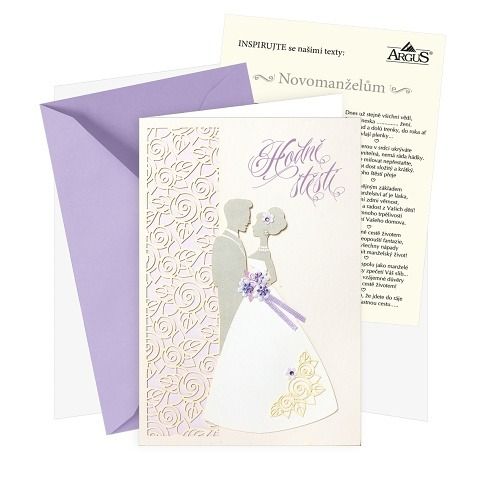 Svatební přání obohaceno o ručně lepené komponenty. S textem na přední straně. Součástí blahopřání je barevně sladěna obálka a inspirační texty, ze kterých můžete použít to, které se vám nejvíce líbí. Originální technologie zpracování přáníčka od společnosti ARGUS - "Na detailu záleží!"