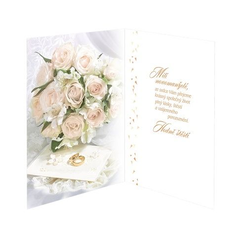 Svatební blahopřání s textem uvnitř: "Milí novomanželé, ze srdce Vám přejeme krásný společný život plný lásky, štěstí a vzajemného porozumění. Hodně štěstí" 3D efekt umocňuje dojem prostoru. Součástí je také barevně sladěná obálka. Originální technologie zpracování od společnosti ARGUS - "Na detailu záleží!"