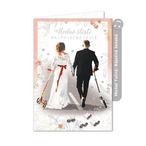 Svatební blahopřání hudební s písní "Michal Tučný: Báječná ženská" Součástí je také barevně sladěná obálka. Text uvnitř : " Milí novomanželé, prstýnky ste si vyměnili, na společnopu cestu se vydali, plní lásky,odhodlání, tak ať vyplní se všecha Vaše přání. Hodne štestí". Originální technologie zpracování od společnosti ARGUS - "Na detailu záleží!"