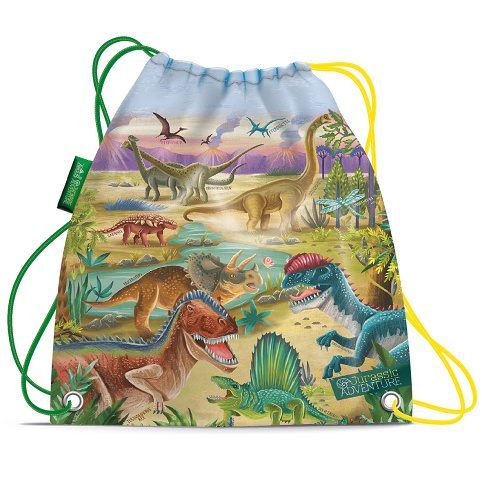 Školní sáček Jurassic adventure na přezůvky a sportovní potřeby s vnitřní kapsou na zip.