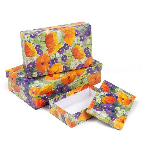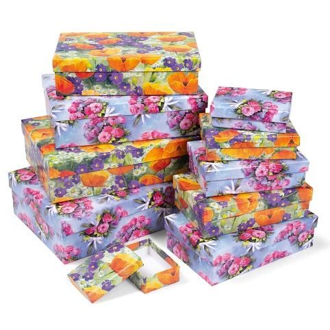 SADA nádherných papírových krabic ve tvaru obdélníku z dílny ARGUSu. Objsahuje 10 ks krabic, 2 různé květinové motivy, z každého motivu je 5 ks v setu. Vhodná nejen k zabalení dárků, ale také jako dekorace do bytu a odkládací prostor pro různé drobnosti v poličkách vašeho domova.