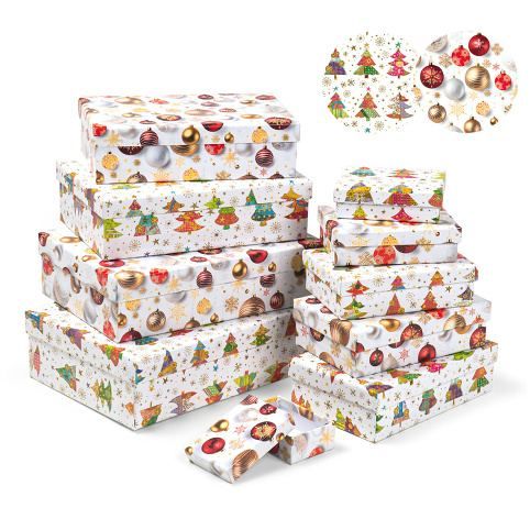 * obsahuje 10 ks krabic, 2 různé vánoční motivy, z každého motivu je 5 ks v setu* vhodná nejen k zabalení dárků, ale také jako dekorace do bytu a odkládací prostor pro různé drobnosti v poličkách vašeho domova* rozměry jednotlivých krabiček: 2531 - 8,5*6*2,8 cm; 2532 - 10,5*7,6*3,2 cm; 2533 - 12,6*8,6*3,6 cm; 2534 - 14,6*9,6*4,2 cm; 2535 - 16,7*10,7*4,8 cm; 2536 - 18,6*11,7*5,3 cm; 2537 - 20,7*12,7*5,7 cm; 2538 - 22,4*14,4*6,3 cm; 2539 - 24,5*16,5*6,6 cm; 2540 - 26,4*17,6*7,3 cm