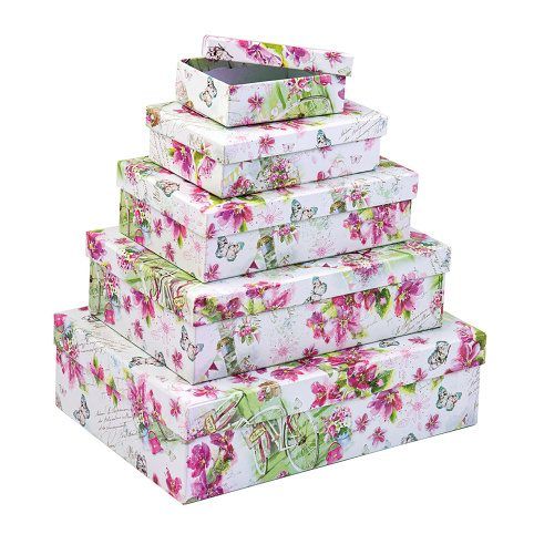 SADA nádherných papírových krabic ve tvaru obdélníku z dílny ARGUSu. Objsahuje 5 ks krabic, květinový motiv. Vhodná nejen k zabalení dárků, ale také jako dekorace do bytu a odkládací prostor pro různé drobnosti v poličkách vašeho domova.