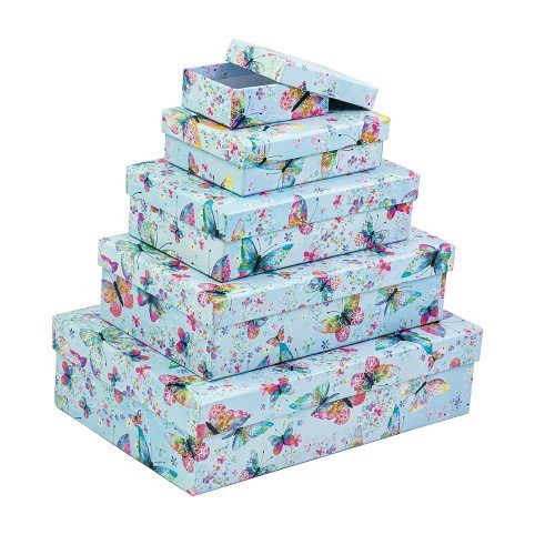 SADA nádherných papírových krabic ve tvaru obdélníku z dílny ARGUSu. Objsahuje 5 ks krabic, motýlí motiv. Vhodná nejen k zabalení dárků, ale také jako dekorace do bytu a odkládací prostor pro různé drobnosti v poličkách vašeho domova.