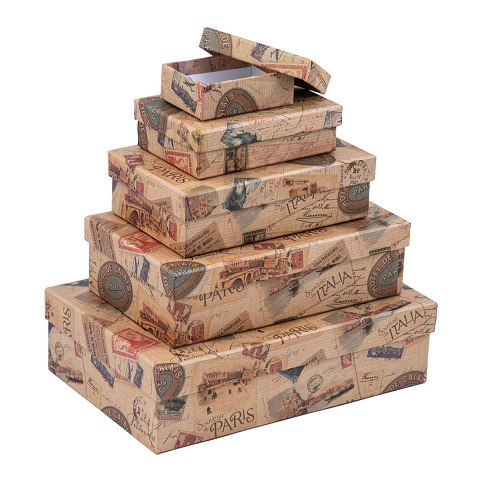 SADA nádherných papírových krabic z přírodního hnědého papíru ve tvaru obdélníku z dílny ARGUSu. Objsahuje 5 ks krabic s cestovatelským motivem. Vhodná nejen k zabalení dárků, ale také jako dekorace do bytu a odkládací prostor pro různé drobnosti v poličkách vašeho domova.