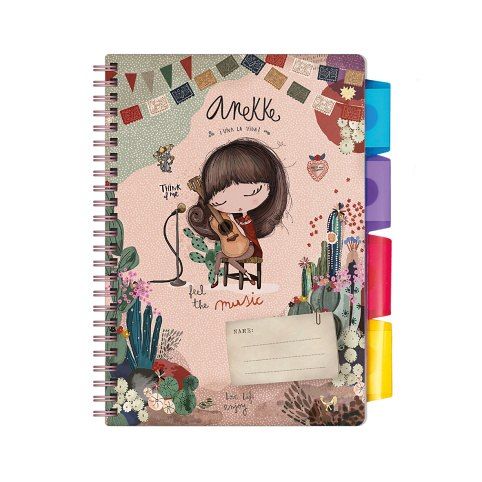 Sešit se záložkami/s plastovými rozřaďovači různých barev s praktickou kapsičkou pro dívky s motivem známého děvčátka Anekke z dílny španělské designérky, velikost A5, linkovaný, 100 listů. Nezbytná součást školních potřeb. Hodí se i do kanceláře
