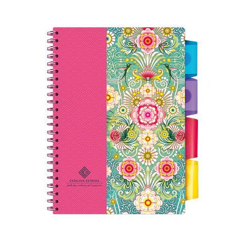 Sešit se záložkami/s plastovými rozřaďovači Catalina Estrada různých barev s praktickou kapsičkou, velikost A5, linkovaný, 100 listů. Nezbytná součást školních potřeb. Hodí se i do kanceláře