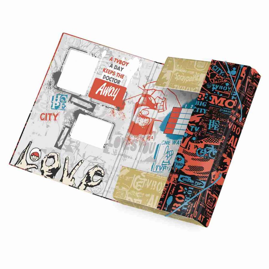 Box velikosti A4 na sešity a jiné dokumenty. Box je z tvrdého papírového materiálu uzavřen ze všech stran s PUV lakováním, vnitřním potiskem a rozvrhem hodin. Box má gumičky v horní a dolní části, které brání samovolnému otevření. Box chrání vaše dokumenty a sešity před poškozením a navíc máte je všechny pěkně v jednom obale.