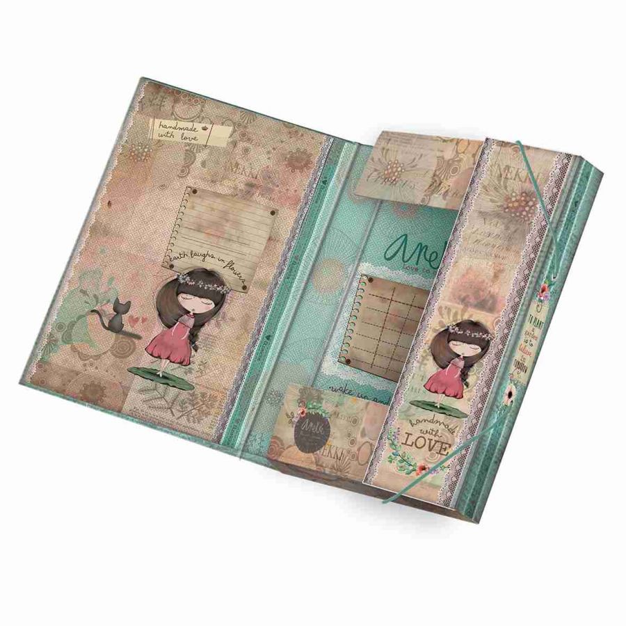 Školní box velikosti A4 na sešity a jiné dokumenty s motivem známého děvčátka Anekke z dílny španělské designérky. Box je z tvrdého papírového materiálu uzavřen ze všech stran s PUV lakováním, vnitřním potiskem a rozvrhem hodin. Box má gumičky v horní a dolní části, které brání samovolnému otevření. Školní box chrání sešity před poškozením a navíc, vaše školačka bude mít všechny sešity pohromadě.