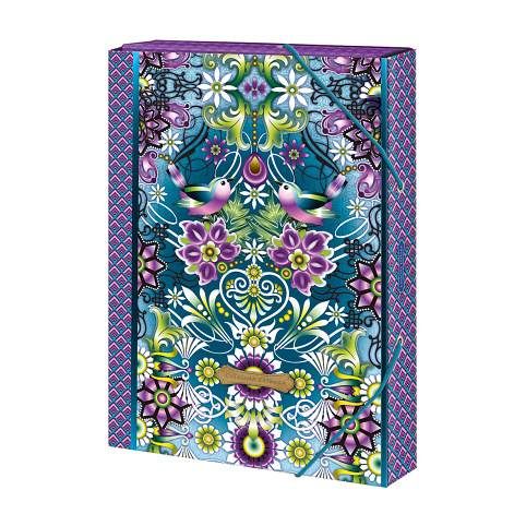 Box velikosti A4 na sešity a jiné dokumenty s motivem z dílny kolumbijské designérky Cataliny Estrady tvořící v Barceloně. Box je z tvrdého papírového materiálu uzavřen ze všech stran s PUV lakováním a jemným vnitřním potiskem. Box má gumičky v horní a dolní části, které brání samovolnému otevření. Box chrání vaše dokumenty a sešity před poškozením a navíc máte je všechny pěkně v jednom obale.