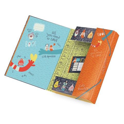 Školní box velikosti A4 Cute Monsters na sešity a jiné dokumenty. Box je z tvrdého papírového materiálu uzavřen ze všech stran s PUV lakováním, vnitřním potiskem a rozvrhem hodin. Box má gumičky v horní a dolní části, které brání samovolnému otevření. Školní box chrání sešity před poškozením a navíc, vaše dítě bude mít všechny sešity pohromadě.