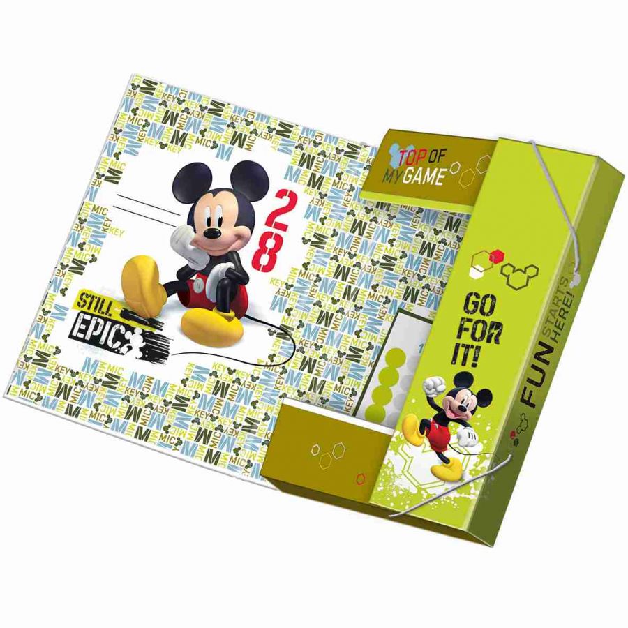 Školní box velikosti A4 na sešity a jiné dokumenty s motivem Mickey z dílny Walta Disneyho. Box je z tvrdého papírového materiálu uzavřen ze všech stran s PUV lakováním, vnitřním potiskem a rozvrhem hodin. Box má gumičky v horní a dolní části, které brání samovolnému otevření. Školní box chrání sešity před poškozením a navíc, vaše školačka bude mít všechny sešity pohromadě.