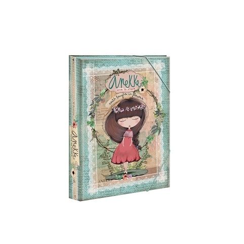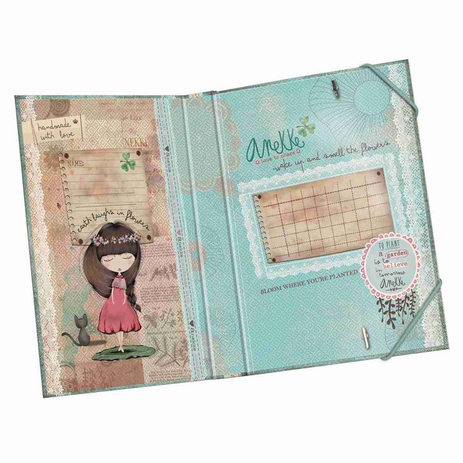 Školní deska velikosti A5 na sešity a jiné dokumenty s motivem známého děvčátka Anekke z dílny španělské designerky. Deska je z tvrdého papírového materiálu s PUV lakováním, vnitřním potiskem a rozvrhem hodin. Deska má gumičky v horní a dolní části, které brání samovolnému otevření. Školní deska chrání sešity před poškozením a navíc, vaše školačka bude mít všechny sešity pohromadě.