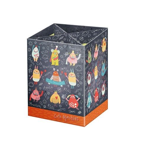 Stojan na pera a tužky Cute Monsters. Stojan na pera je praktickou pomůckou, jak udržet na stole školáka pořádek a mít základní psací a kreslicí potřeby po ruce. Jeho vnitřní prostor je rozdělen na 4 části. Stojan je vyroben z kvalitního tvrdého kartonu.