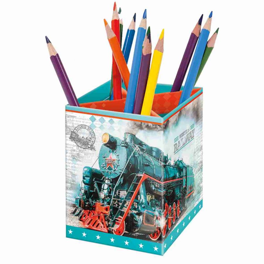 Stojan na pera a tužky Train. Stojan na pera je praktickou pomůckou, jak udržet na stole školáka pořádek a mít základní psací a kreslicí potřeby po ruce. Jeho vnitřní prostor je rozdělen na 4 části. Stojan je vyroben z kvalitního tvrdého kartonu.