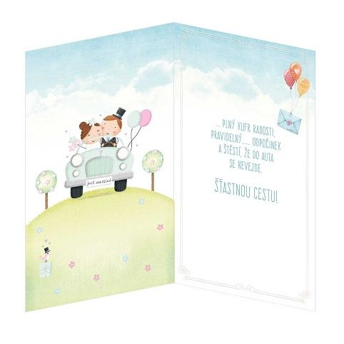 Svatební přání s textem uvnitř: "...plný kufr radosti, pravidelný...odpočinek a štěstí, že do auta se nevejde. Šťastnou cestu!". Součástí přání je barevně sladěná obálka. Originální technologie zpracování od společnosti ARGUS - "Na detailu záleží!"