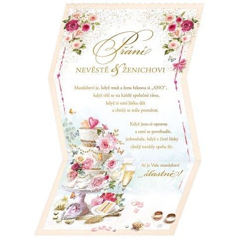 Svatební přání s textem uvnitř. Součástí přání je barevně sladěna obálka. Originální technologie zpracování od společnosti ARGUS - "Na detailu záleží!"