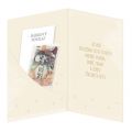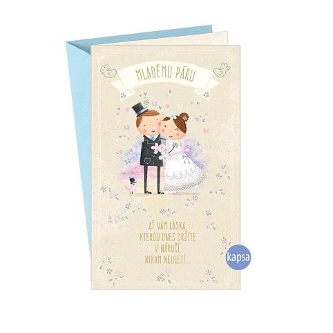 Svatební přání s kapsou na peníze. Text uvnitř: "...ať Vaši společnou cestu životem provází pohoda, dobré zdraví a úsměv šťastných dětí!". Součástí přání je barevně sladěná obálka. Technologie zpracování: výsek, slepotisk, ražba.