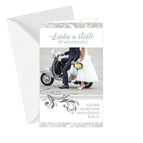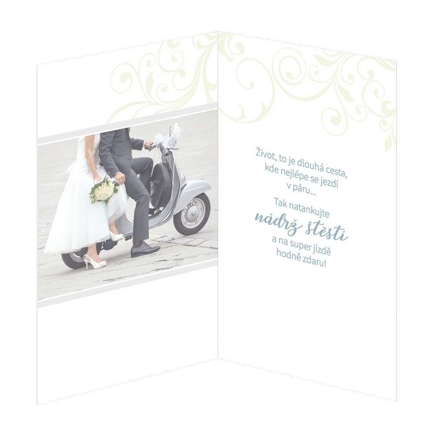 Svatební přání. Text uvnitř: "Život, to je dlouhá cesta, kde nejlépe se jezdí v páru... Tak natankujte nádrž štěstí a na super jízdě hodně zdaru!" Součástí přání je barevně sladěna obálka. Originální technologie zpracování od společnosti ARGUS - "Na detailu záleží!"