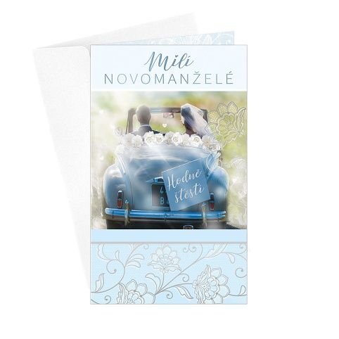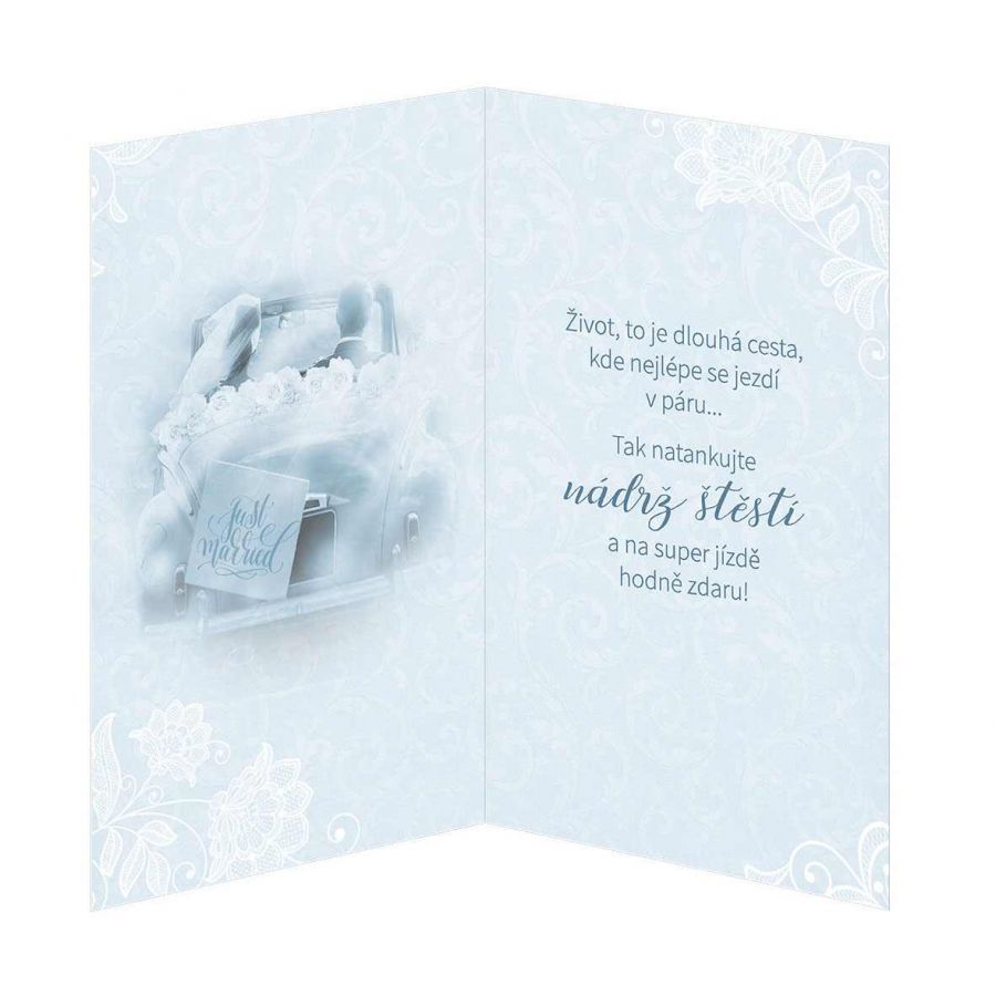 Svatební přání. Text uvnitř: "Život, to je dlouhá cesta, kde nejlépe se jezdí v páru... Tak natankujte nádrž štěstí a na super jízdě hodně zdaru!" Součástí přání je barevně sladěna obálka. Originální technologie zpracování od společnosti ARGUS - "Na detailu záleží!"