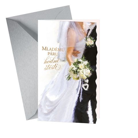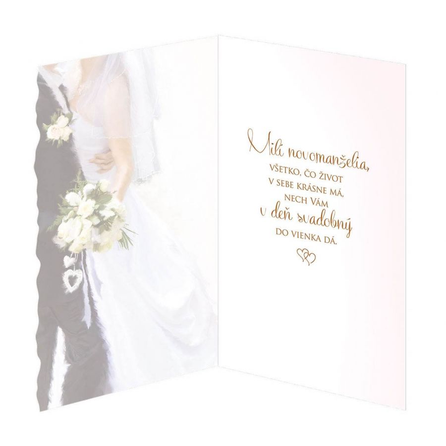 Svatební přání. Text uvnitř: "Jen láska životu smysl dává, láska čistá, láska pravá... I Vaše láska, ať je dokonalá, ať nezmenší ji všednost dní a léty se jen násobí. Krásný společný život!" Součástí přání je barevně sladěna obálka. Originální technologie zpracování od společnosti ARGUS - "Na detailu záleží!"