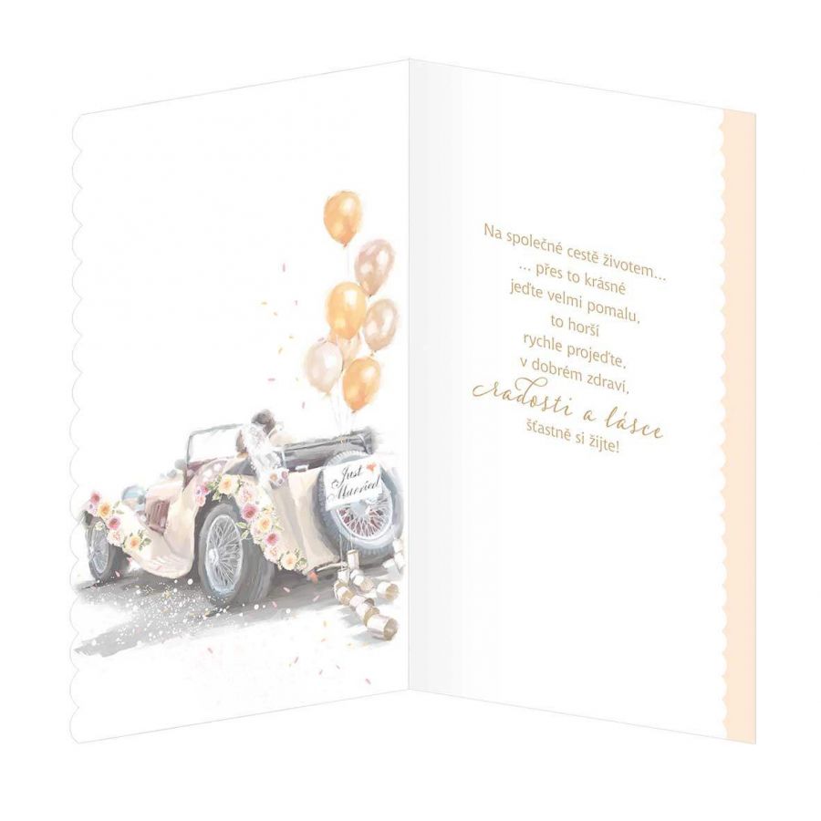 Svatební přání. Text uvnitř: "Na společné cestě životem... ...přes to krásné jeďte velmi pomalu, to horší rychle projeďte, v dobrém zdraví, radosti a lásce šťastně si žijte!" Součástí přání je barevně sladěna obálka. Originální technologie zpracování od společnosti ARGUS - "Na detailu záleží!"
