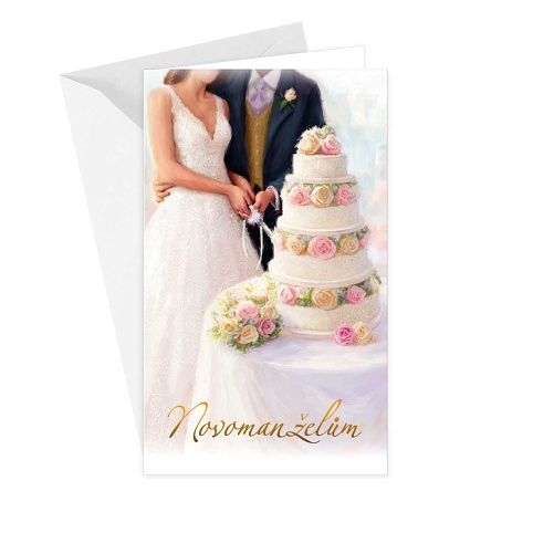 Svatební přání. Text uvnitř: "Dnes vykročíte spolu jako manželé a snubní prstýnky zpečetí Váš slib... Mnoho lásky a vzájemné důvery na společné cestě životem!" Součástí přání je barevně sladěna obálka. Originální technologie zpracování od společnosti ARGUS - "Na detailu záleží!"