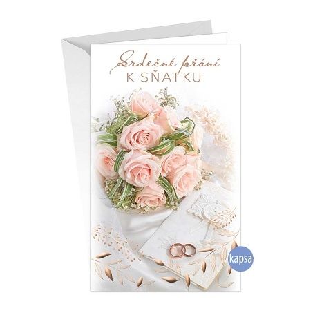 Svatební přání. Text uvnitř: "Milí novomanželé, jeden pro druhého ať jste vždy oporou, ať Vaše prstýnky nejsou jen ozdobou. Ve Vašem krásném manželském svazku poznajte jen samé štěstí a lásku." Součástí přání je barevně sladěna obálka. Originální technologie zpracování od společnosti ARGUS - "Na detailu záleží!"