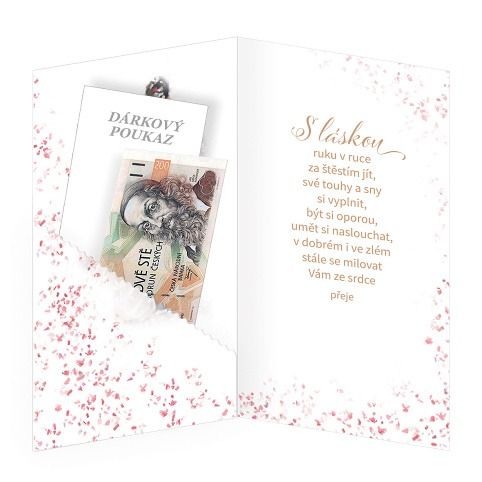 Svatební blahopřání s kapsou na peníze a textem uvnitř přání. Součástí blahopřání je také barevně sladěná obálka. Originální technologie zpracování od společnosti ARGUS - "Na detailu záleží!"
