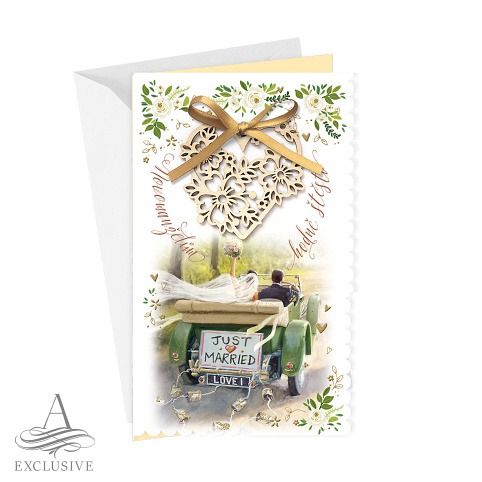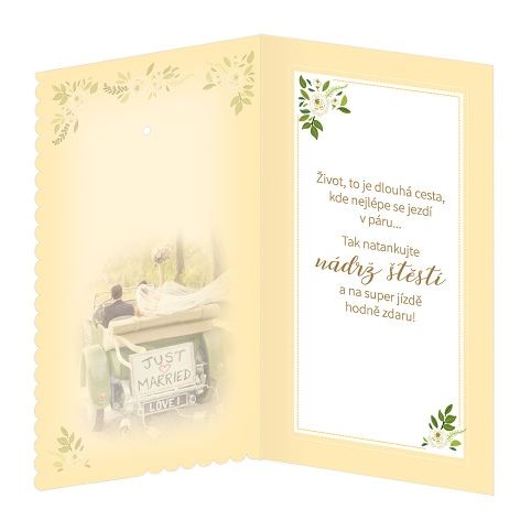 Svatební přání s textem uvnitř. Přání zaujme dřevěnou ozdobou na přední straně. Součástí přání je barevně sladěna obálka. Originální technologie zpracování od společnosti ARGUS - "Na detailu záleží!"
