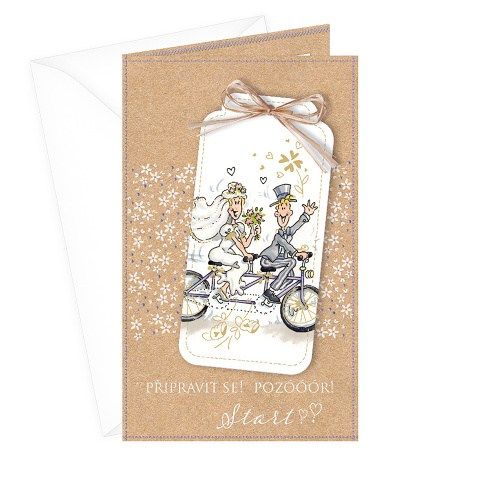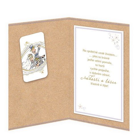 Svatební přání. Text uvnitř: "Na společné cestě životem... ...přes to krásné jeďte velmi pomalu, to horší rychle projeďte, v dobrém zdraví, radosti a lásce šťastne si žijte!" Součástí přání je barevně sladěna obálka. Originální technologie zpracování od společnosti ARGUS - "Na detailu záleží!"