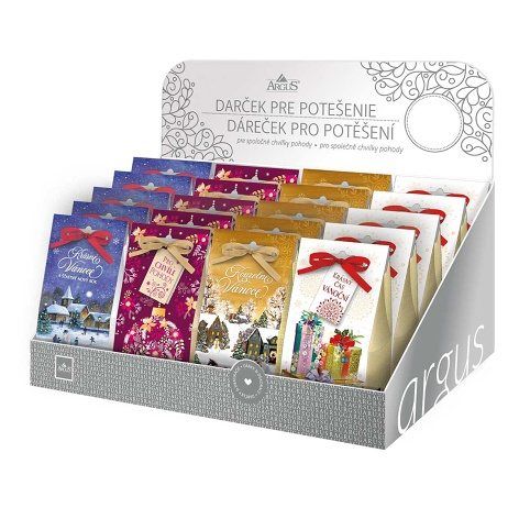 Balení mixu luxusních dárkových krabiček s vánočním motivem, mašličkou a sypaným čajem. Obsahuje 20 krabiček sypaných čajů – v 1 krabičce se nachází 50g sypaného čaje vysoké kvality. Dodavatel: FYTOPHARMA, Malacky, Slovensko. Různé texty a motivy.