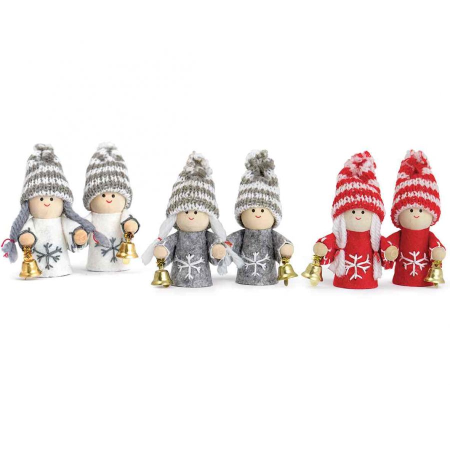 Textilní figurky v plastovém boxíku. Figurky jsou dřevěné, kombinované s textilií a pletenou čepičkou. Každá figurka má malou šňůrku na zavěšení a v ruce zvoneček. Vhodné jako dárek i vánoční ozdoba na stromeček a také jako vánoční dekorace do aranžmá.