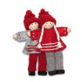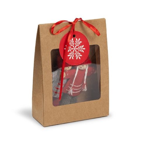 Textilní figurky v dárkové krabičce z pevného kraftového papíru. Figurka má hlavu, dlaně a boty ze dřeva, ostatní části jsou textilní, čepička pletená. Každá figurka má malou šňůrku na zavěšení. Vhodné jako dárek i vánoční ozdoba na stromeček a také jako vánoční dekorace do aranžmá. Cena za balení, 2 ks figurek.