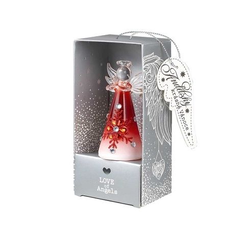 Vánoční ozdoba a dekorace - skleněný anděl ve stříbrné dárkové krabičce s textem na přívěsku ve tvaru andělského křídla. Krásný malý vánoční dárek přátele.