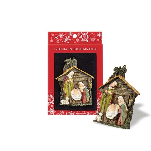 Vánoční ozdoba z pryskyřice - Betlém - dekorace na zavěšení se šňůrkou. Je vhodný i jako malý vánoční dárek, zabalený v červené krabičce.